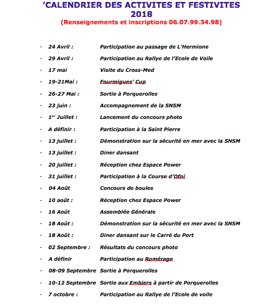 A noter que notre Assemblée Générale se tiendra en août cette année et que nous repartirons passer un WE à Porquerolles les 08 et 09 septembre avant de rejoindre les Embiers pour ceux qui le souhaiterons.