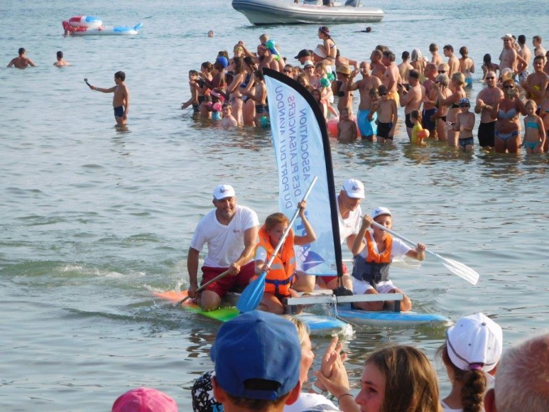 Apres la course"garçons de café"où les concurrents devaient relier,yeux bandès,plateau chargè,la mairie,l'office de tourisme,l'école de voile,ils se sont élancés sur la plage pour rejoindre les embarcations.